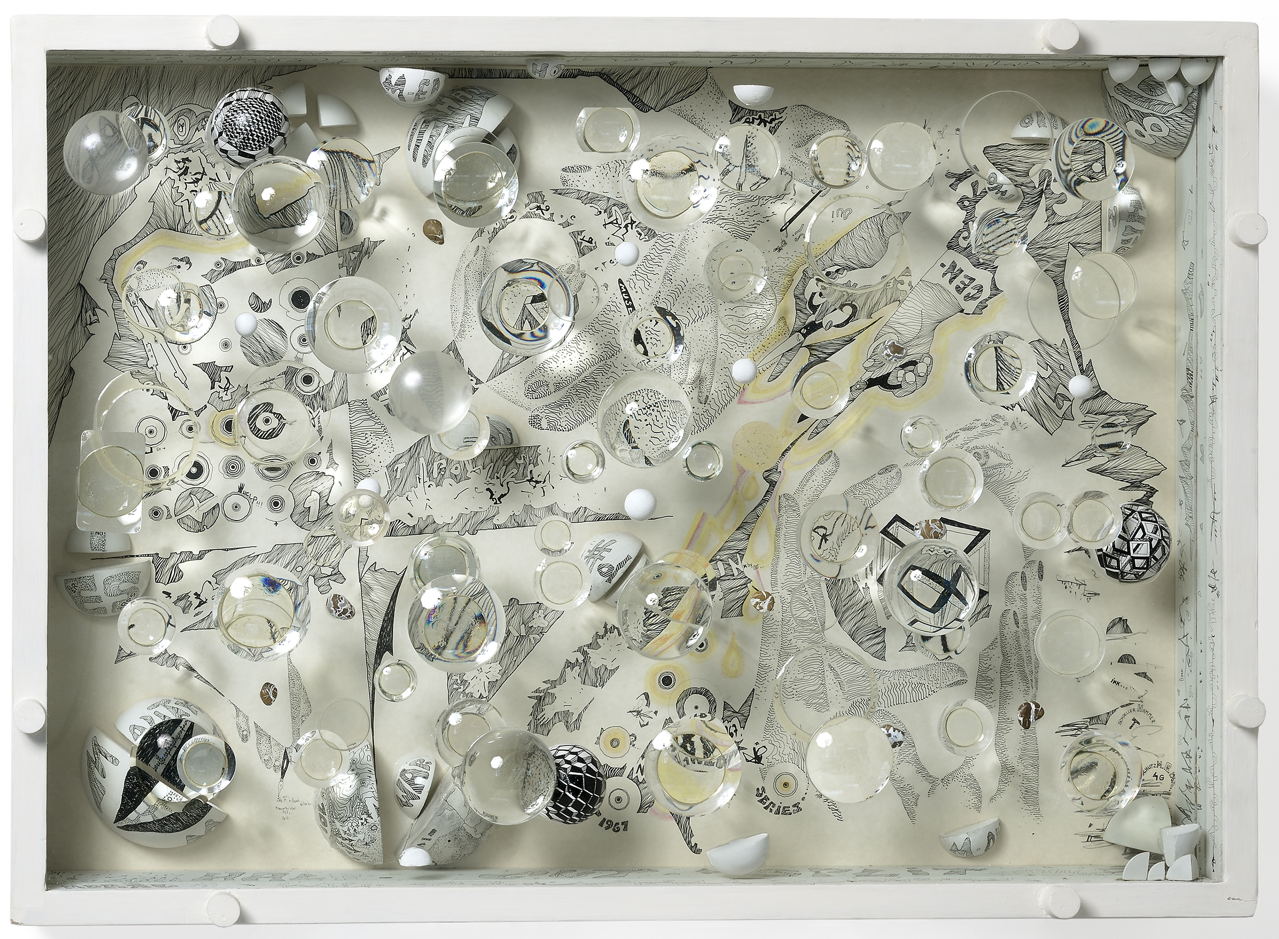 Legno sagomato e dipinto, sassi, vetro, lenti ottiche, inchiostro e matite colorate