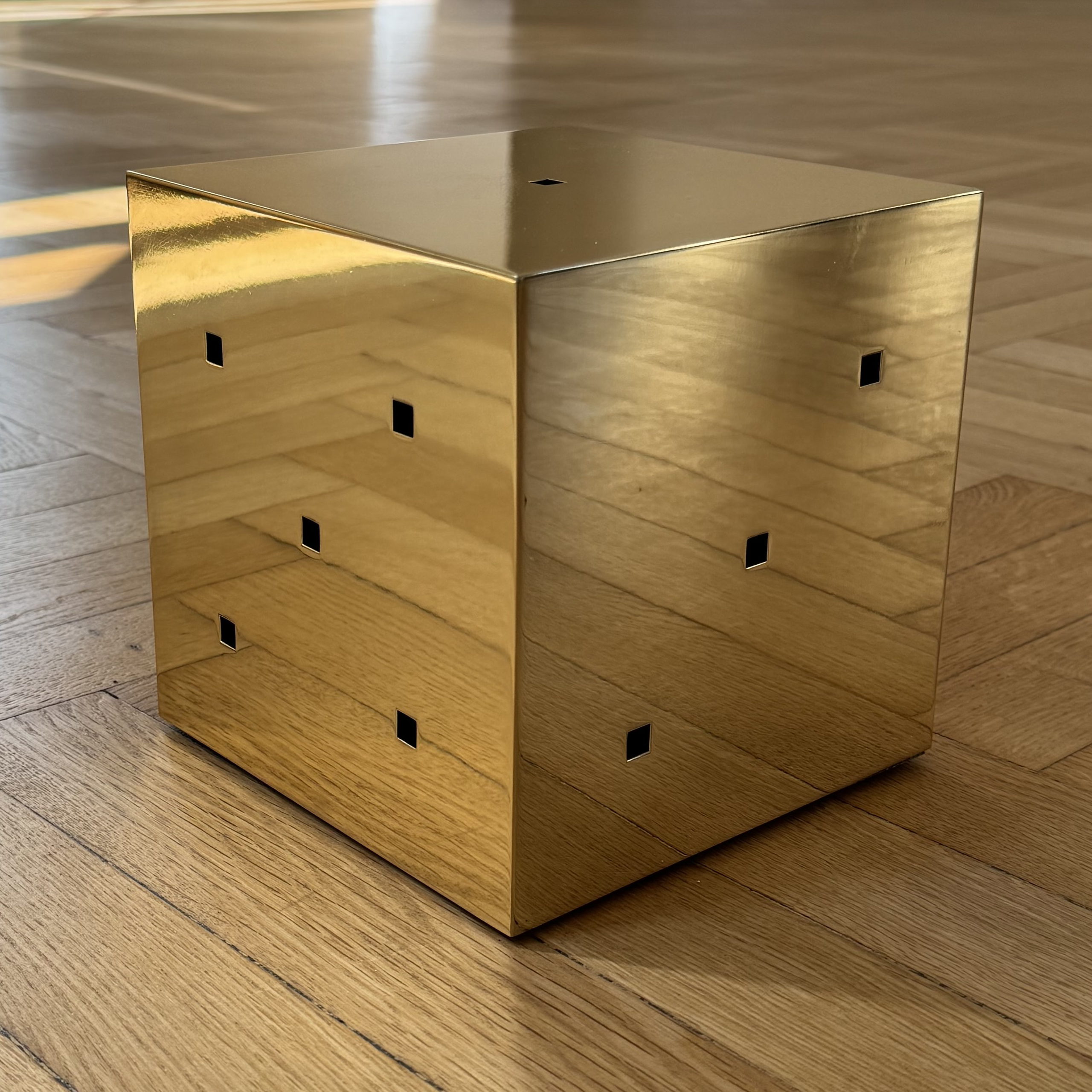 Assembled brass plates and pipes, internal lighting,